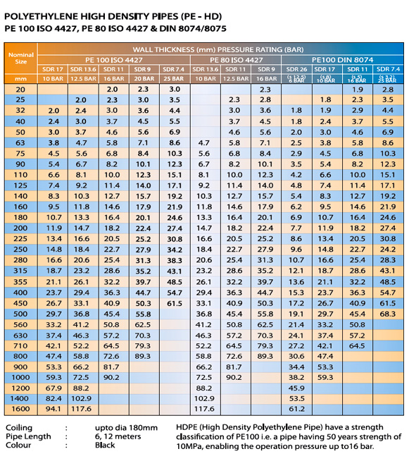 Polyethylene material shows excellent resistance to rapid crack propagation and slow crack growth both being benefits for pressure pipes. PE100 & PE80 pipes are flexible and offer greater mechanical resistance when compared to other pipes.