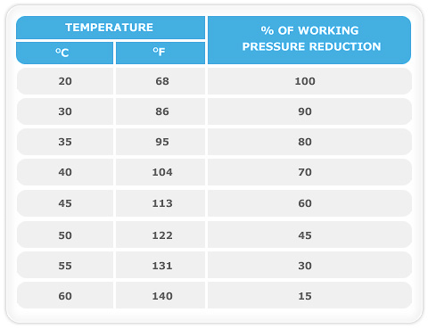 Where the carried in a pipeline is 20°C and the ambient temperature is 20°C – the maximum working pressure should be reduced by 2% for every degree oC the fluid temperature is above 20°C.